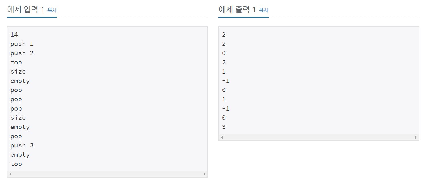 for문 안에는 문제에서 요구하는 스택의 함수들이 구현되어있으며,