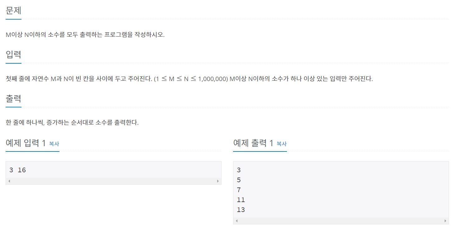 자연수 M과 N 사이의 소수들을 오름차순으로 출력하는 것이 목표이다.