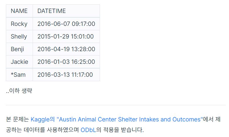 SELECT : 이름(NAME)과 보호시작일(DATETIME) 정보를 (이어지는 FROM 절에서의)