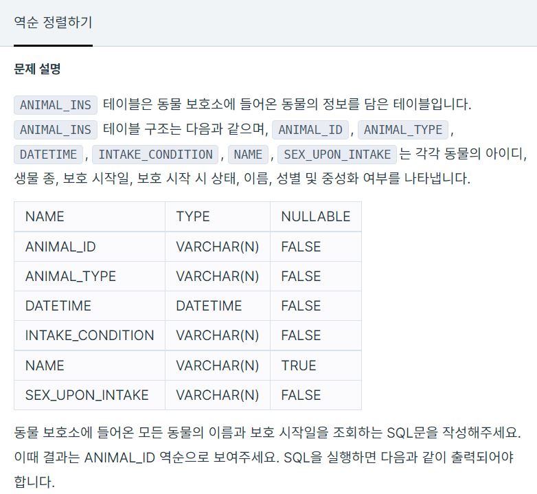 ANIMAL_ID 역순으로 조회하는 SQL문을 작성하는 것이 목표이다.