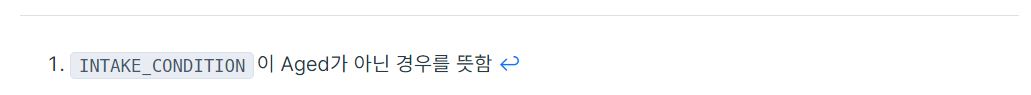WHERE 문을 통해 INTAKE_CONDITION이 Aged가 아닌 경우를 조회해야한다.