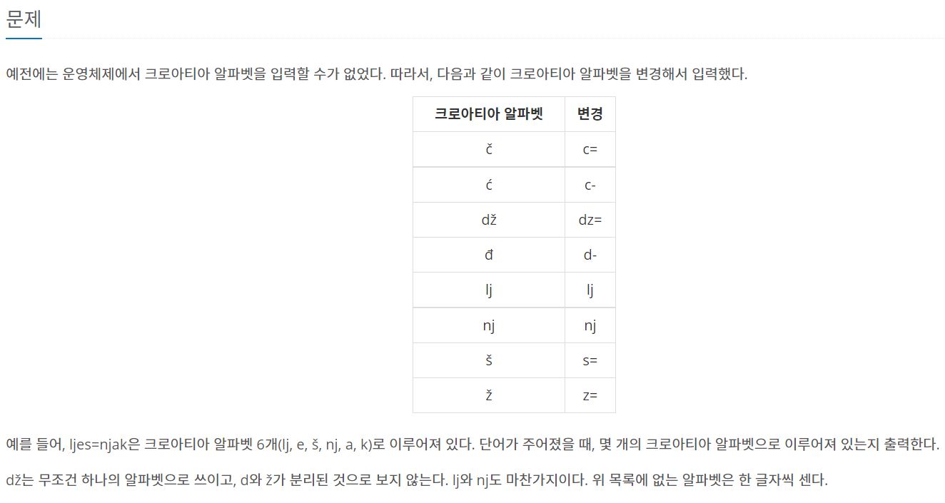 크로아티아 알파벳의 갯수를 구하면 되는 비교적 간단한 문제이다.