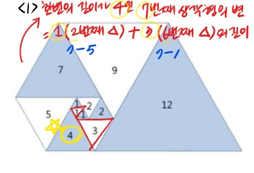 여기서, 삼각형 내부의 숫자는 해당 삼각형의 한 변의 길이이다.