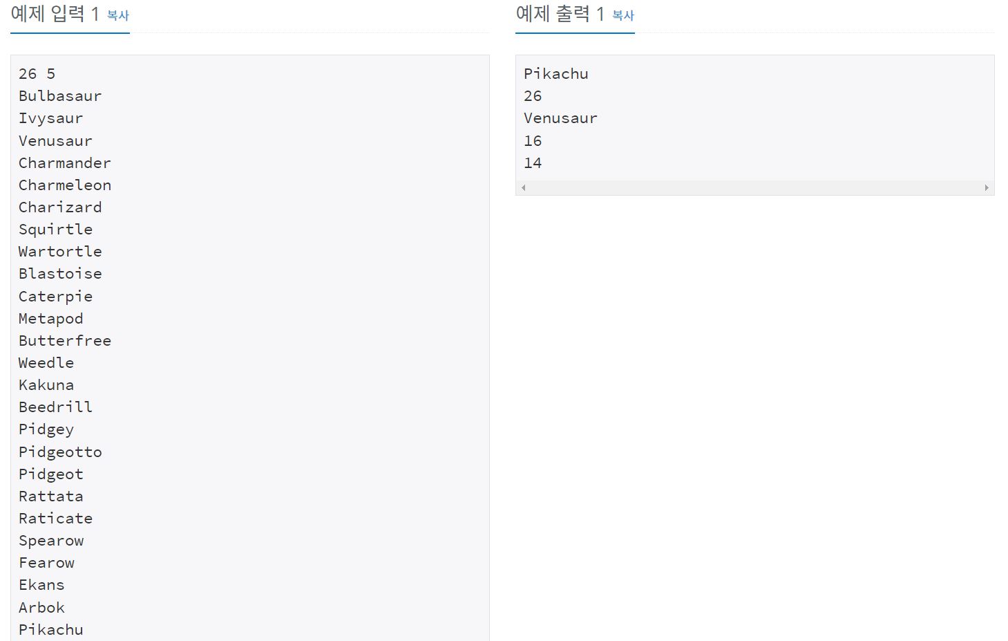 1번부터 N번까지의 포켓몬의 이름을 입력받고, M개의 문제를 풀이해 출력하면 되는 문제이다.