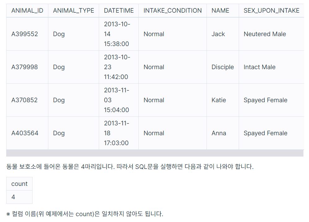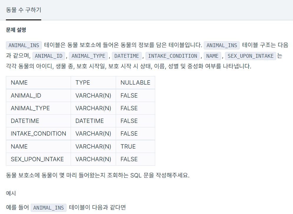 동물 보호소에 들어온 동물들이 몇 마리인지 조회하는 SQL문을 작성하는 것이 목표이다.