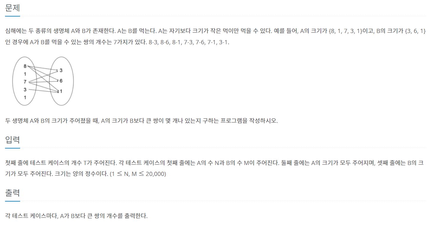 [C++] 백준 7795번 먹을 것인가 먹힐 것인가 본문