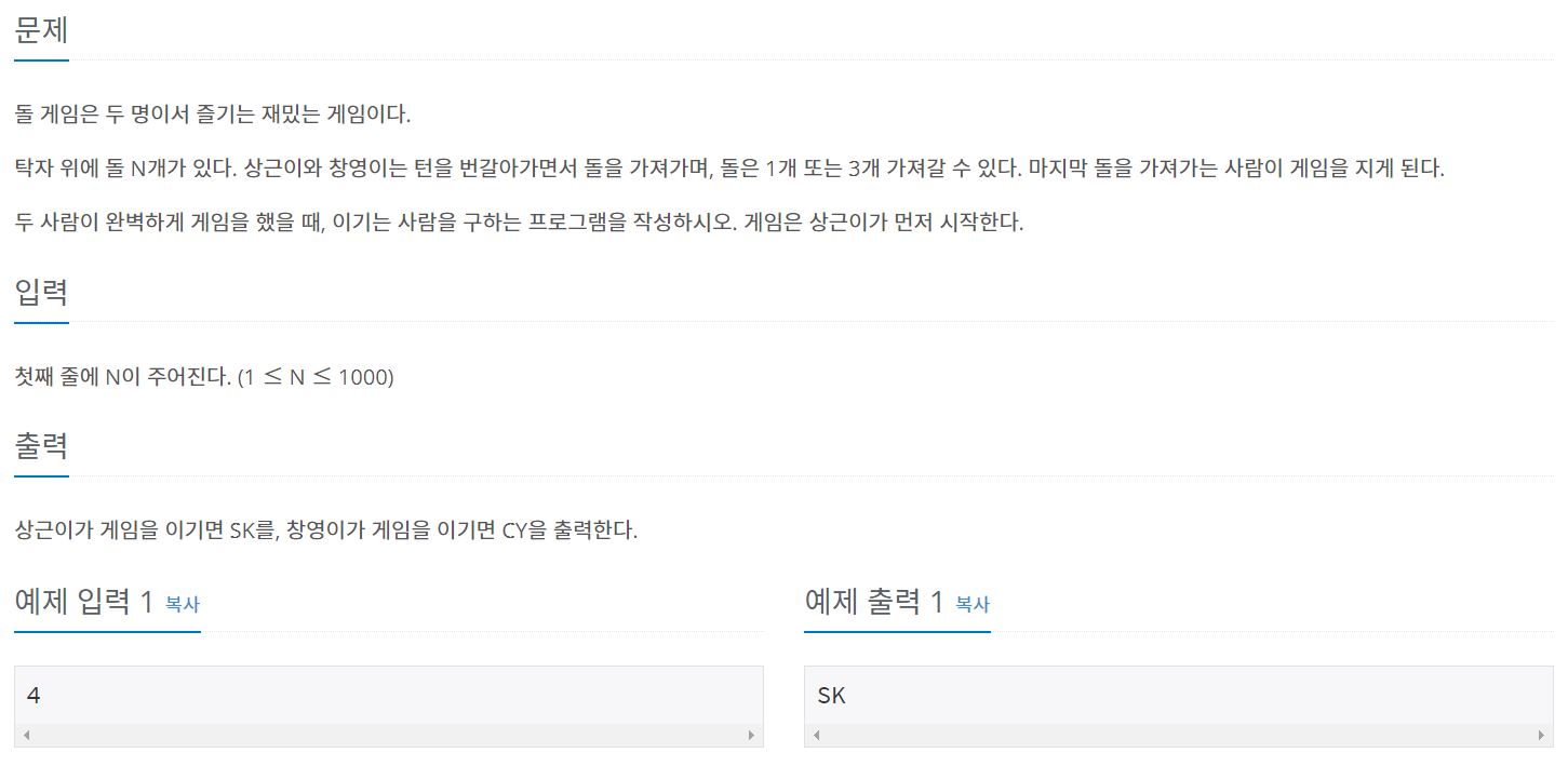 1. 문제이해 9655번: 돌 게임 (acmicpc.net) 9655번: 돌 게임 상근이가 게임을 이기면 SK를, 창영이가 게임을 이기면 CY을 출력한다. www.acmicpc.net 탁자 위의 돌 N개가 있고, 상근이와 창영이는 게임을 하려