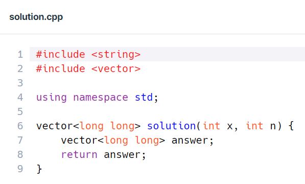함수 solution은 정수 x와 자연수 n을 입력 받아, x부터 시작해 x씩 증가하는 숫자를 n개 지니는 리스트를 리턴해야 합니다. 다음 제한 조건을 보고, 조건을 만족하는 함수, solution을 완성해주세요.