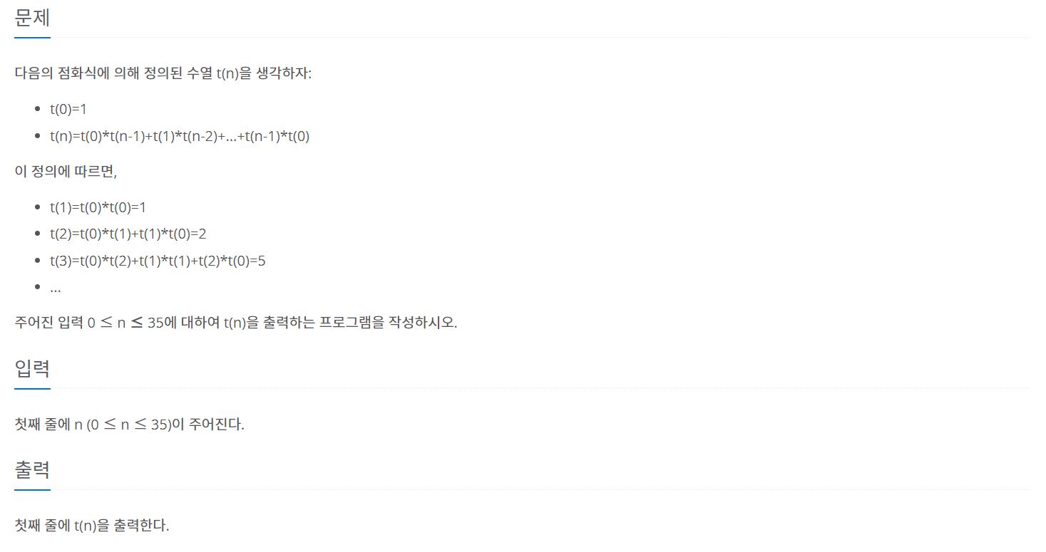 문제에서 준 점화식은 t(n) = t(0) * t(n-1) + t(1) * t(n-2) + ... + t(n-1) * t(0) 으로,
