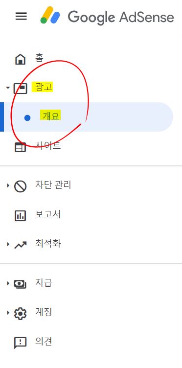 위와 같이 구글 애드센스 홈페이지로 들어가면, 좌측 화면에 다음과 같은 메뉴를 확인할 수 있다.