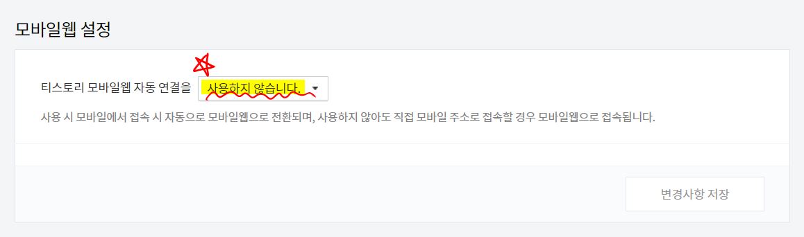 여기서 티스토리 모바일웹 자동 연결을 사용하지 않습니다. 로 바꾸어 저장해주어야 한다.