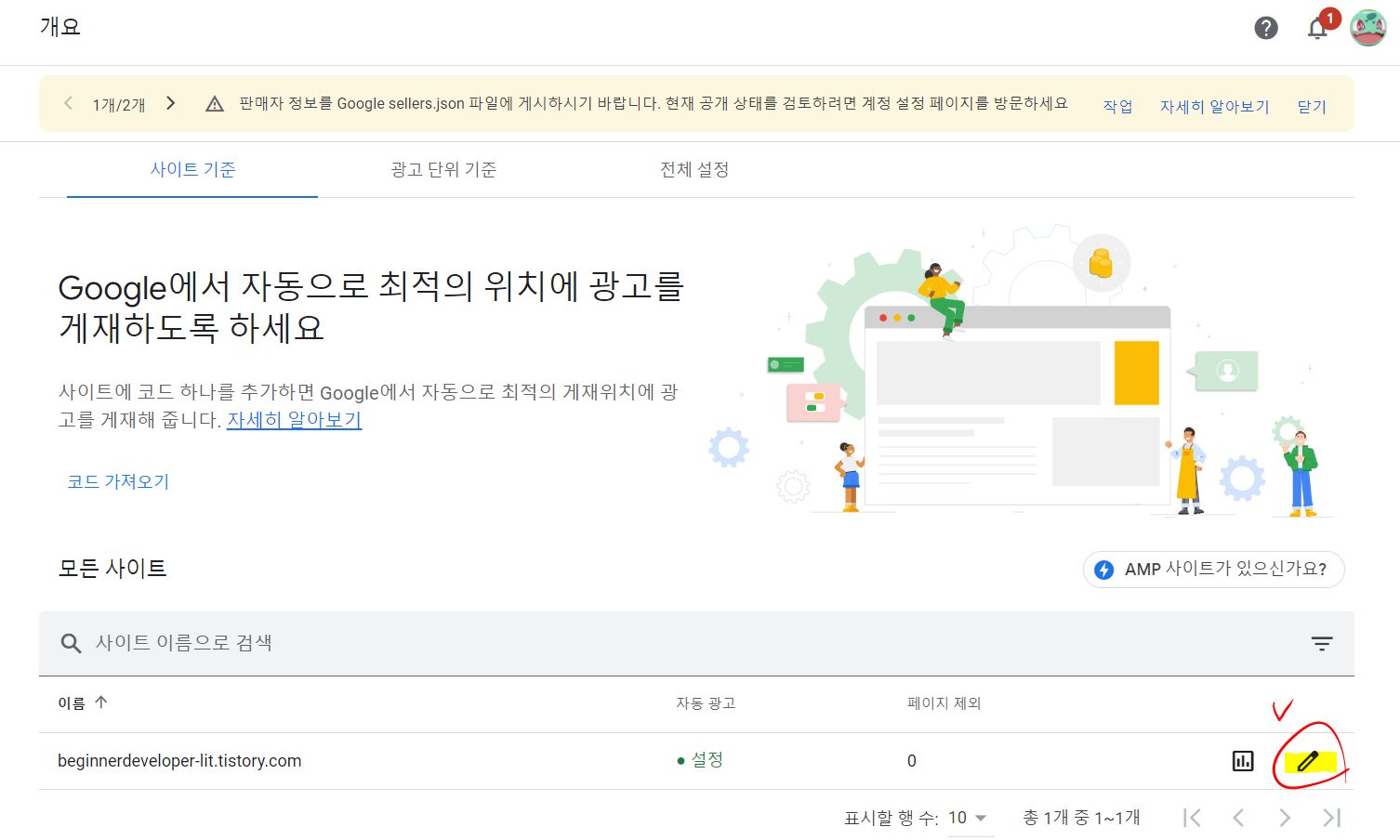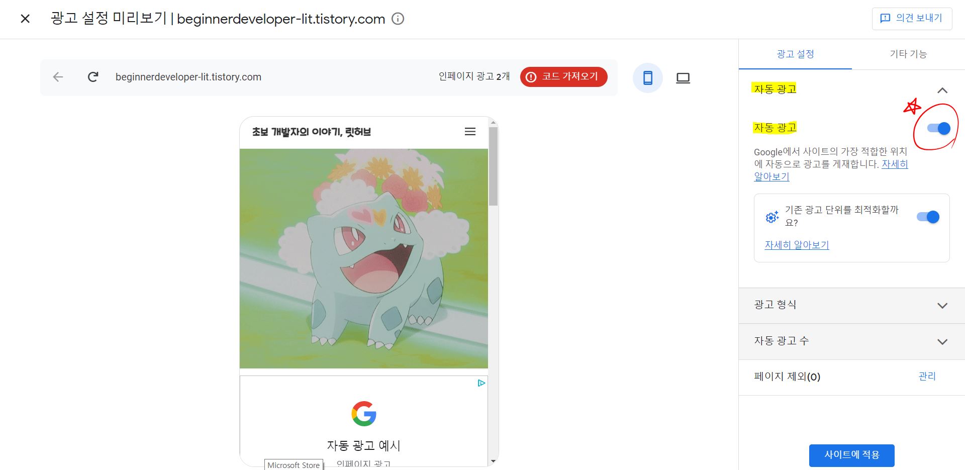 이후 다음과 같은 화면이 나타나면, 우측 광고설정의 자동광고를 클릭,
