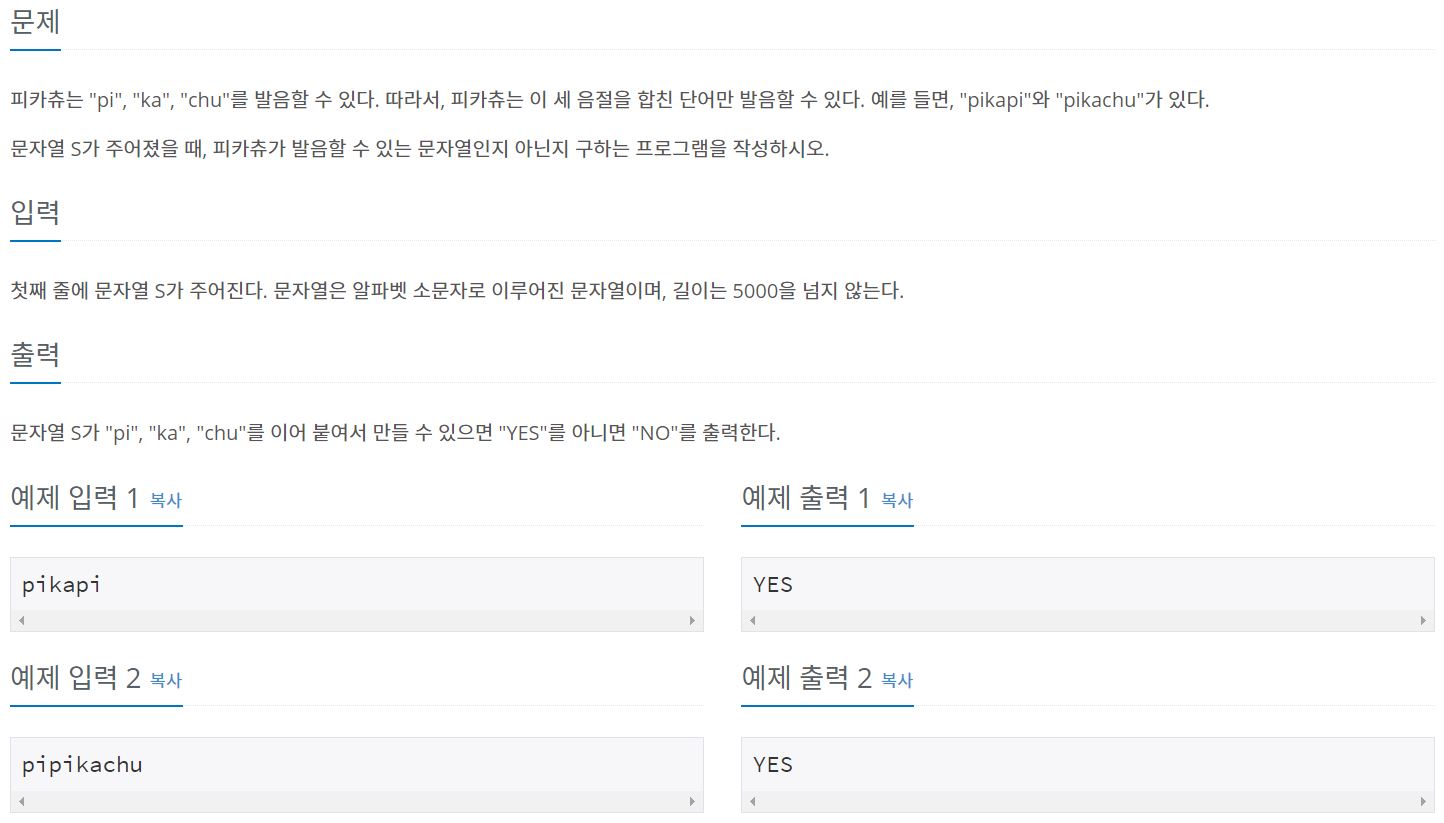 피카츄는 "pi", "ka", "chu"를 발음할 수 있다. 따라서, 피카츄는 이 세 음절을 합친 단어만 발음할 수 있다. 예를 들면, "pikapi"와 "pikachu"가 있다. 문자열 S가 주어졌을 때, 피카츄가 발음할 수 있는 문